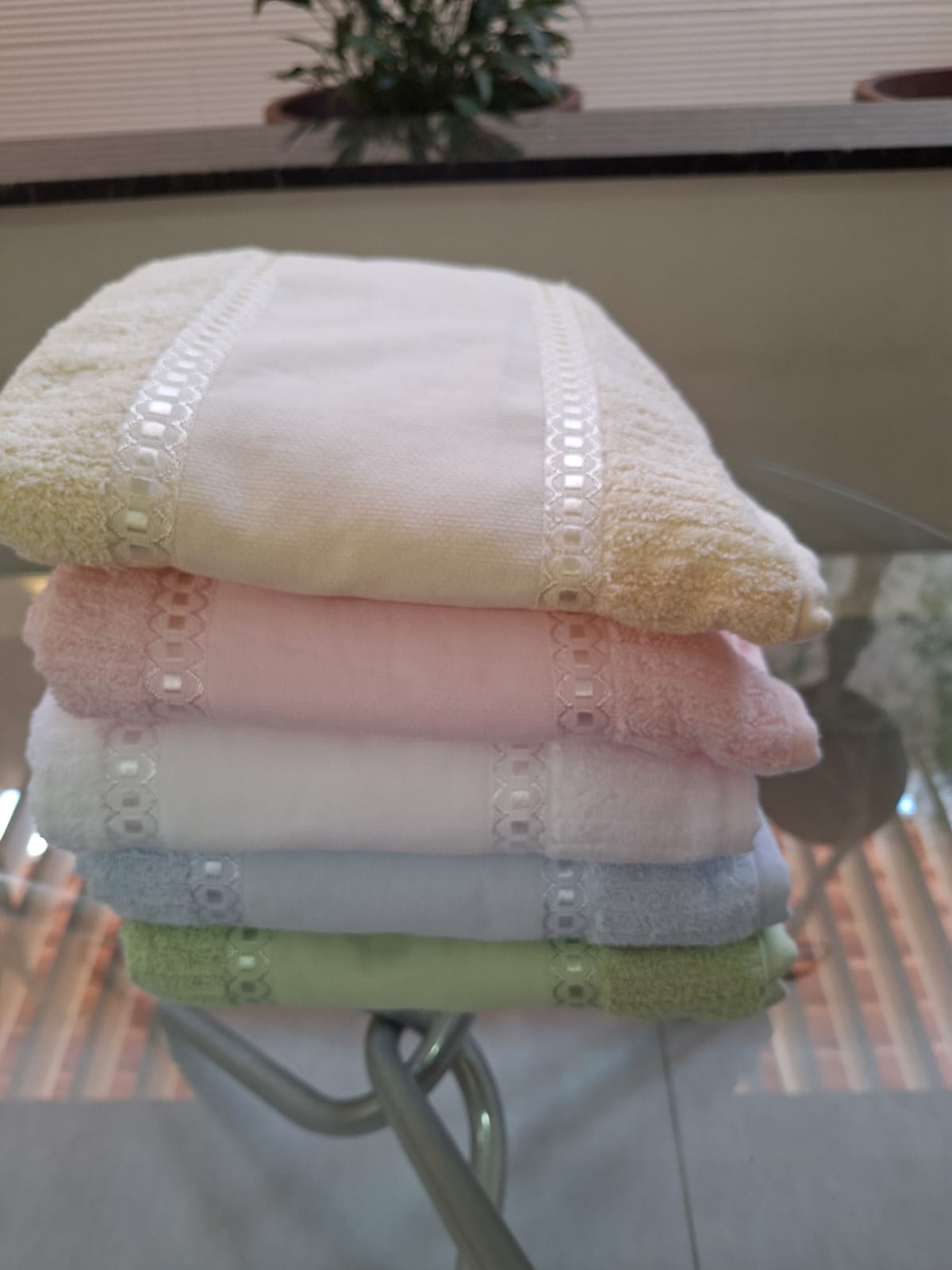 As toalhas Passa Fitas foram desenvolvidas para quem gosta de personalizar peças com acabamento delicado e visual artesanal. Com espaço próprio para aplicação de fitas, pintura e bordado, elas são ideais para artesãs, bordadeiras ou para quem deseja criar peças exclusivas para presentes e enxovais.